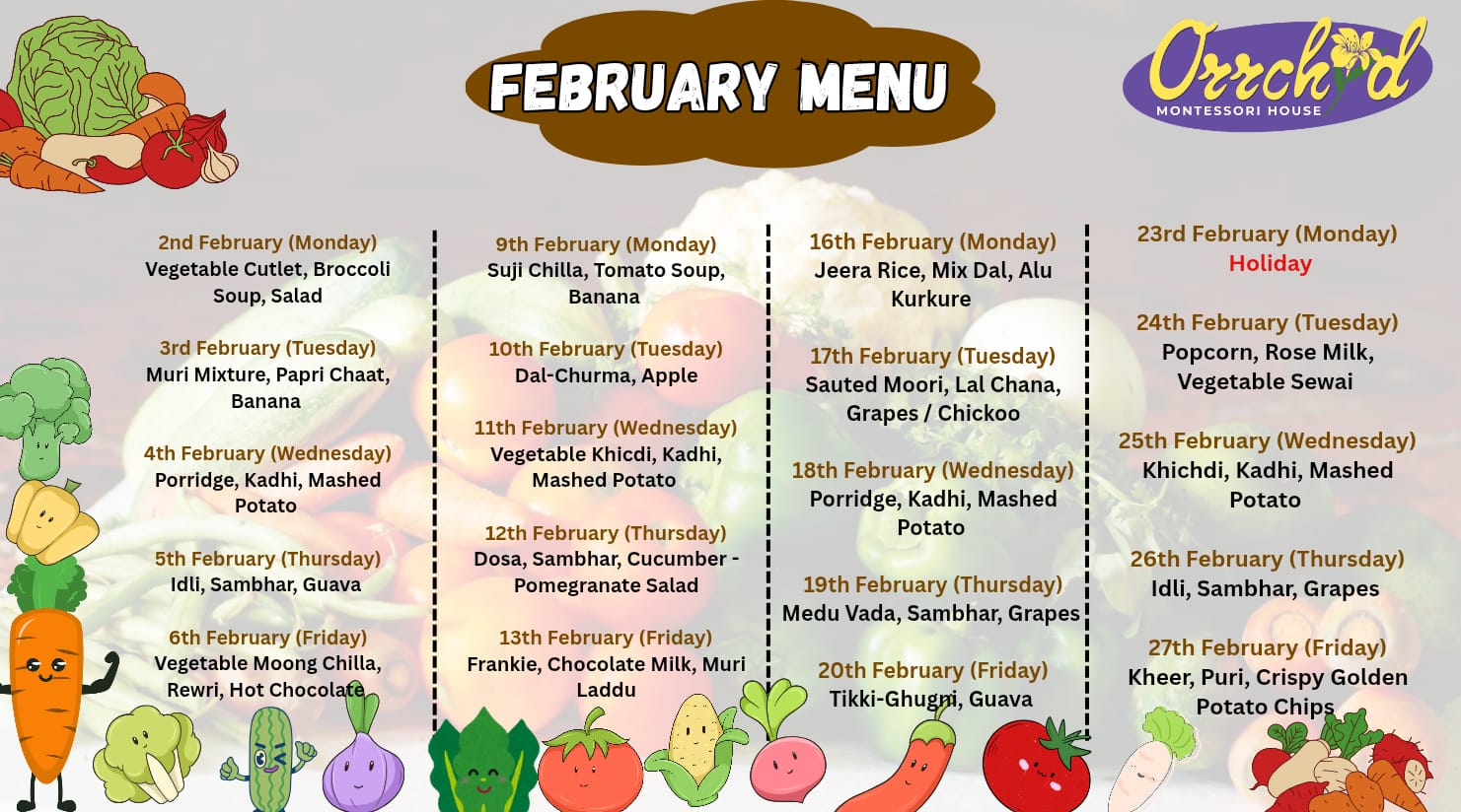 At Orchid Montessori House, we ensure that your child receives a nutritious, balanced, and child-friendly meal every day. Our menu is carefully curated to include a variety of healthy ingredients, seasonal fruits, and fun food experiences — all while keeping in mind children’s preferences and nutritional needs.